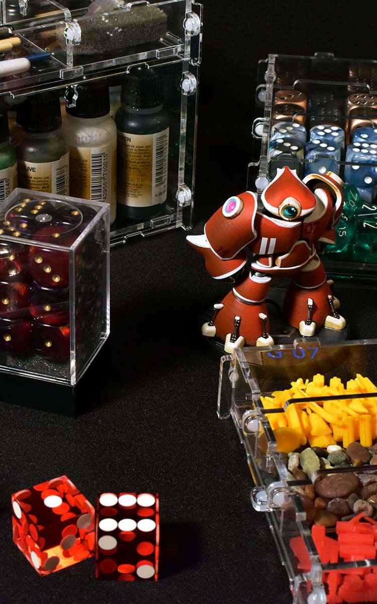 Each game has a ton of tokens, dice, cards, markers, dials, templates, etc… The list goes on and on, and each one is important! The solution had to make finding your accessories easy, be as flexible as possible to account for the myriad different types of accessories and components, and work flawlessly with the Crystal Fortress system.